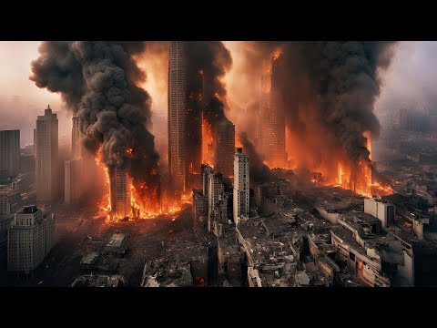 Just now/ ahora mismo City/ciudad is / esta on / en fire /fuego, residential skyscrapers/ rascacielos and a factory/ factoria are /son engulfed in flames /llamaradas